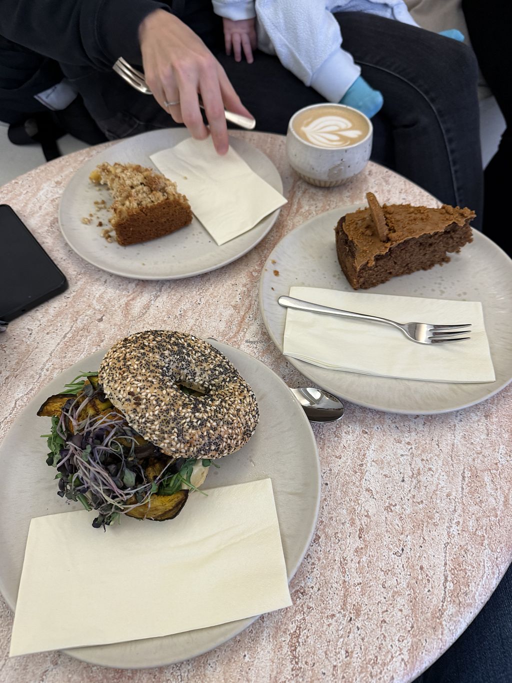 Fancy coffee place with clearly marked vega options such as bagels, cakes and milk alternatives.