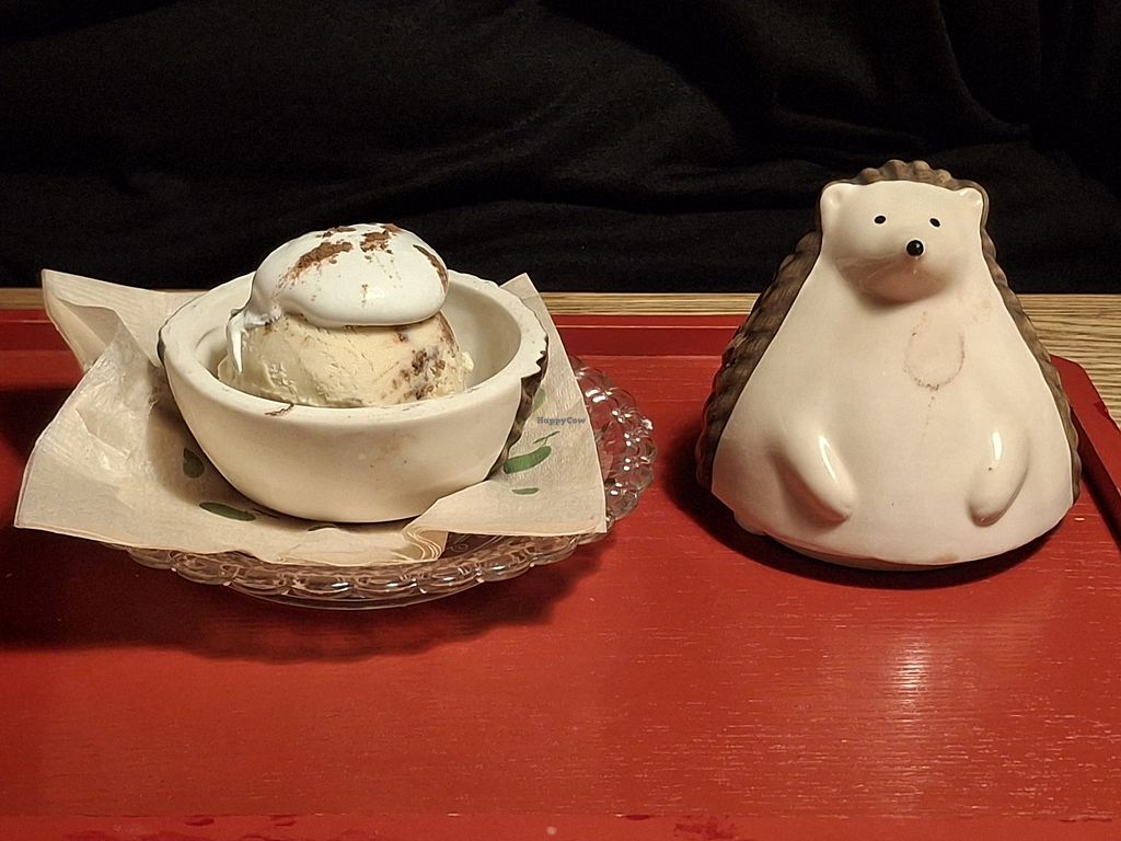We cooked tofu in a pot at our own table with the recommendation in what way to eat the different tofu (silken tofu on the sides, more chewy tofu in the middle). The sushi we had was super fish-like in texture according to my carnivore husband, and was really delicious. The dessert was very good and served in a cute hedgehog dish. Especially the matcha Sakura creme brulee was very good. The owner even shared some of his personal sake with us. Very nice experience!