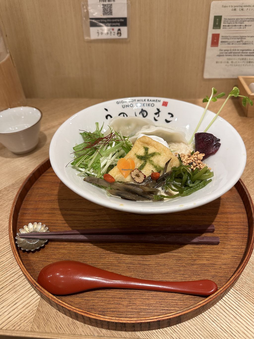 We wandered into this place almost at random, using Google to lead us to any vegetarian eatery nearby. After 2 weeks of combini onigiri in Shikoku we felt like we were in heaven. Beautiful surroundings, friendly, attentive staff, absolutely delicious ramen, and who wouldn't want to make their own tofu at the table?? Yes, it is at the more expensive end, but so worth it compared to the ain soph burger of the day before (which was fine I hasten to add). We felt this meal was worth every cent for flavour, presentation and ambience. And the bathroom is great :).
