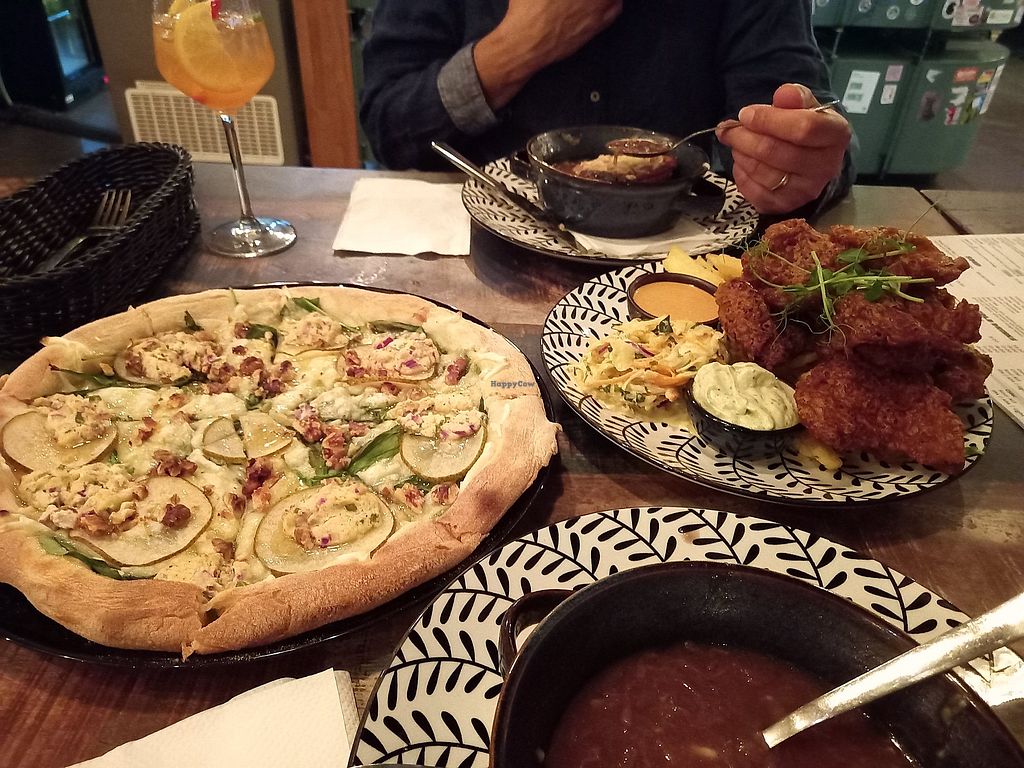 The food was really good. We had French onion soup then crispy mushrooms and pizza. Everything was delicious. Be aware, the portions are huge. We ordered far to much!