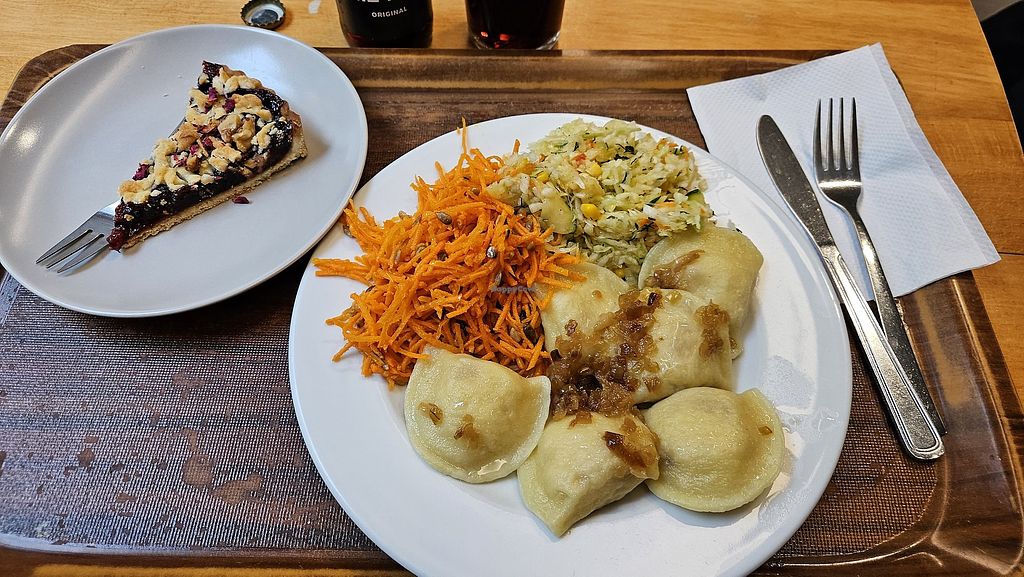 Veganised traditional Polish dishes (but not only), lots of cakes. It is difficult to make up your mind about what to get . Super friendly staff. I will be back 100%.