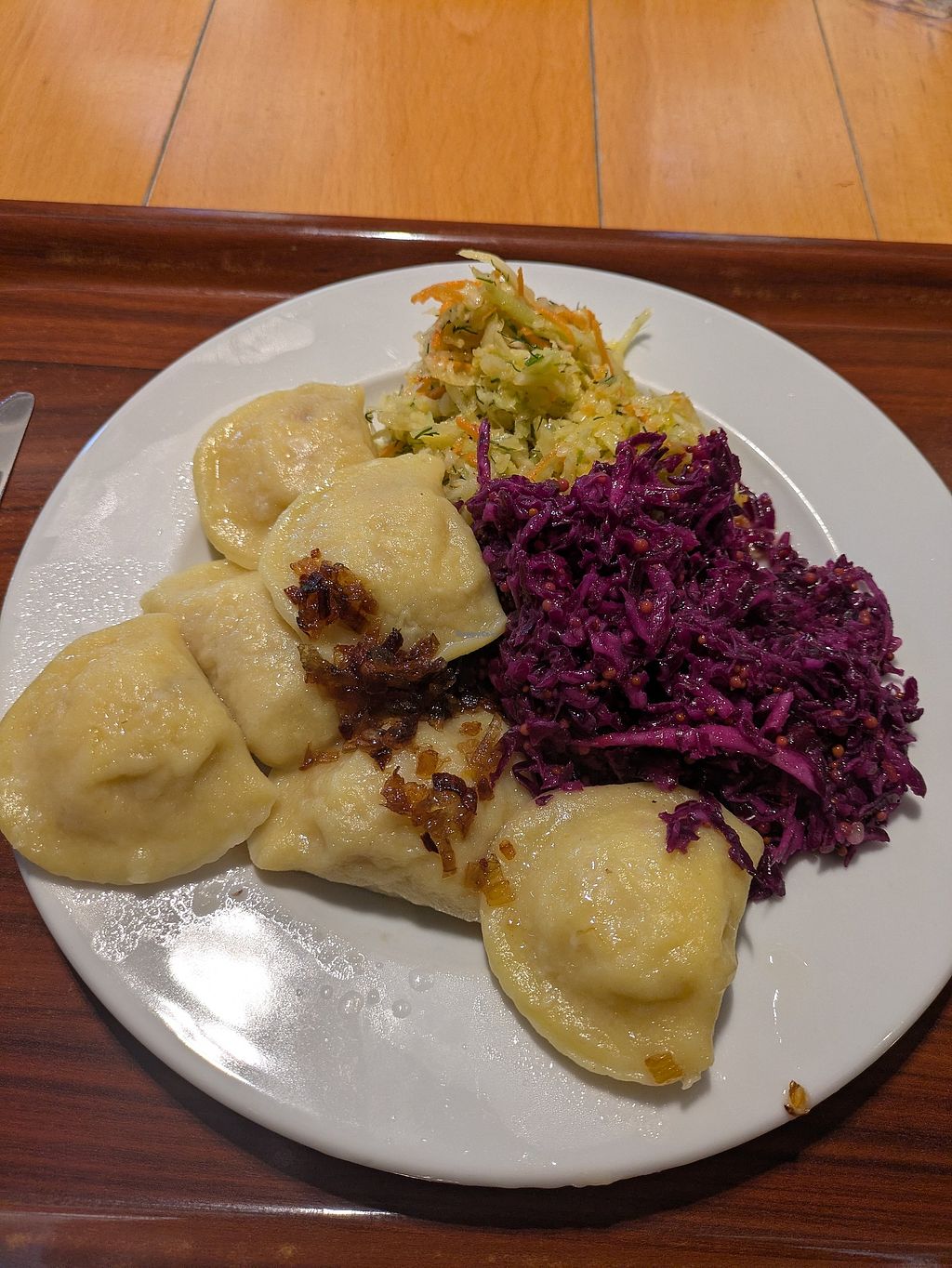Upstairs and downstairs are different restaurants it seems so check each menu before you decide. I went to the upstairs restaurant for dinner and had the potato pierogi with a raspberry lemonade which was super filling and delicious. I then went back in the morning and got a cupcake for breakfast on the go.