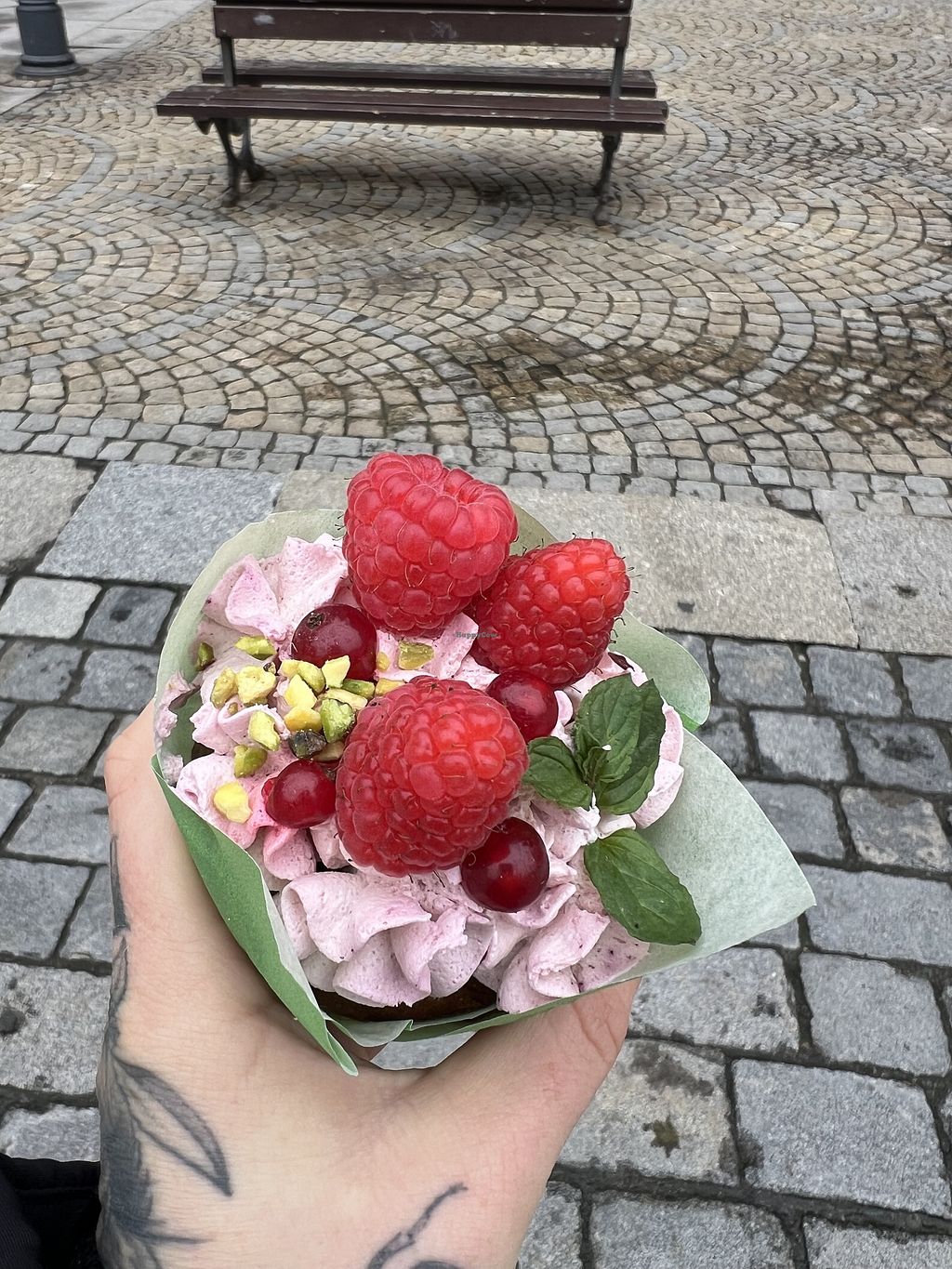 This place is unbelievable. Right on the square, VG and proud. We had the same dishes (potato pancakes with goulash and the dumplings) two days in a row, they were that good! The cookie was awesome, the cake was great - even got a t shirt! Really well priced, wish we could go back..