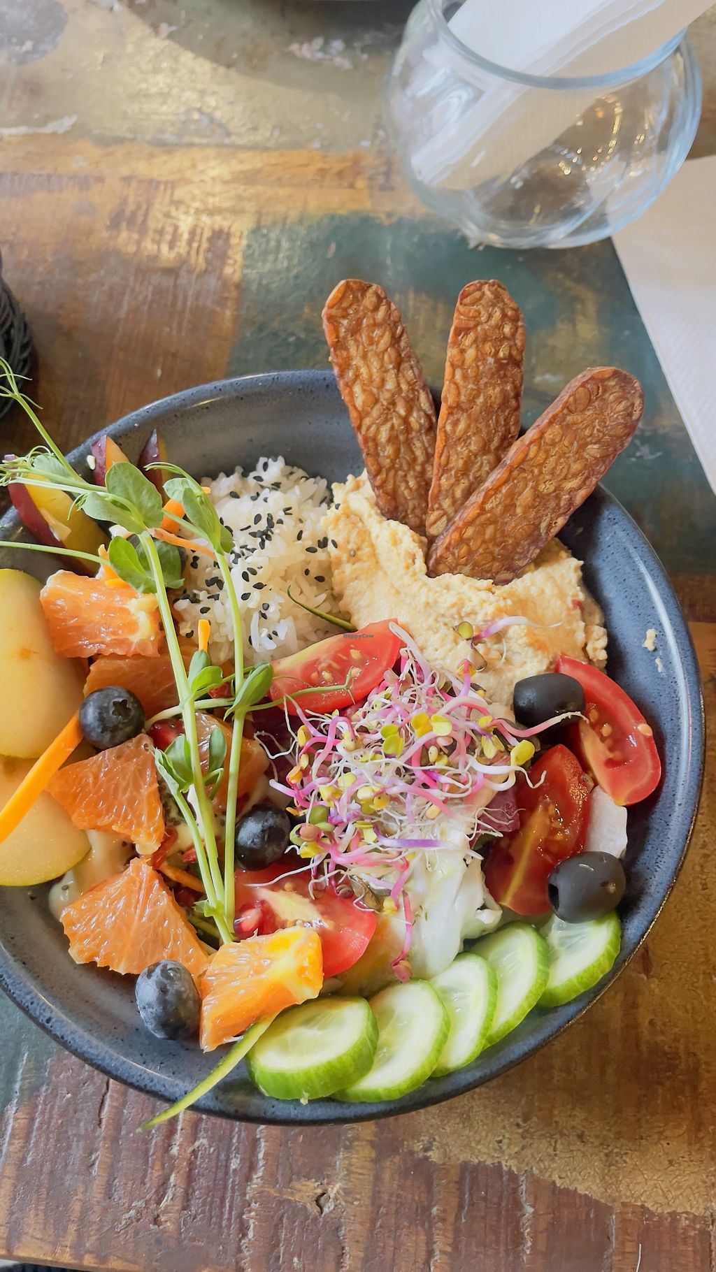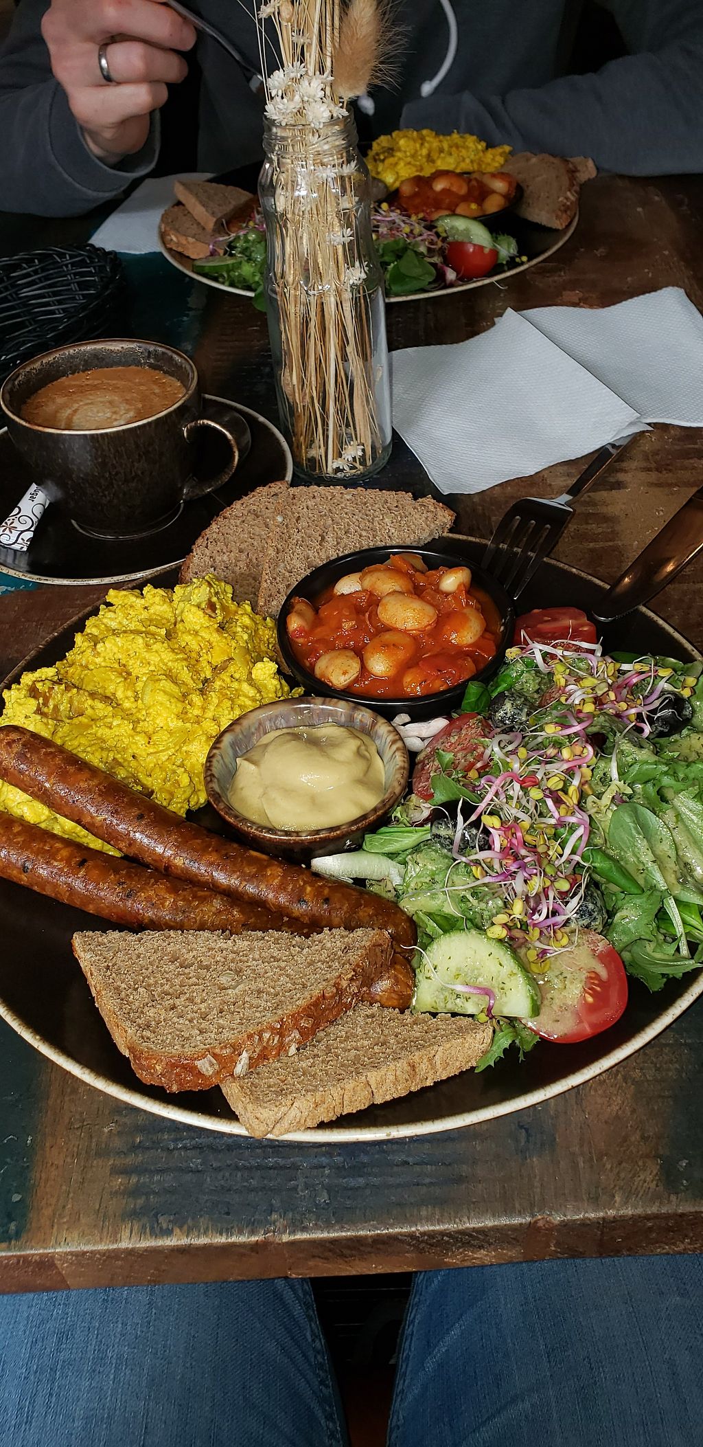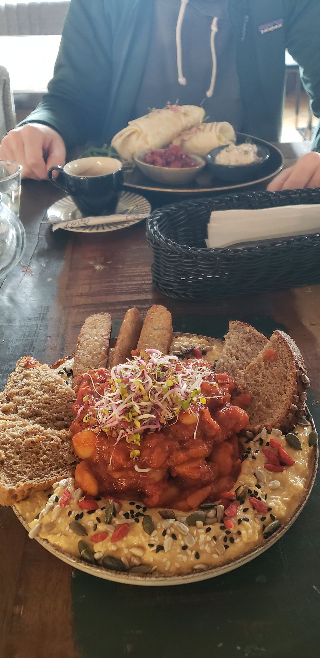 Front hummus and baked beans with tempeh. Back scrambled tofu wrap wit…
