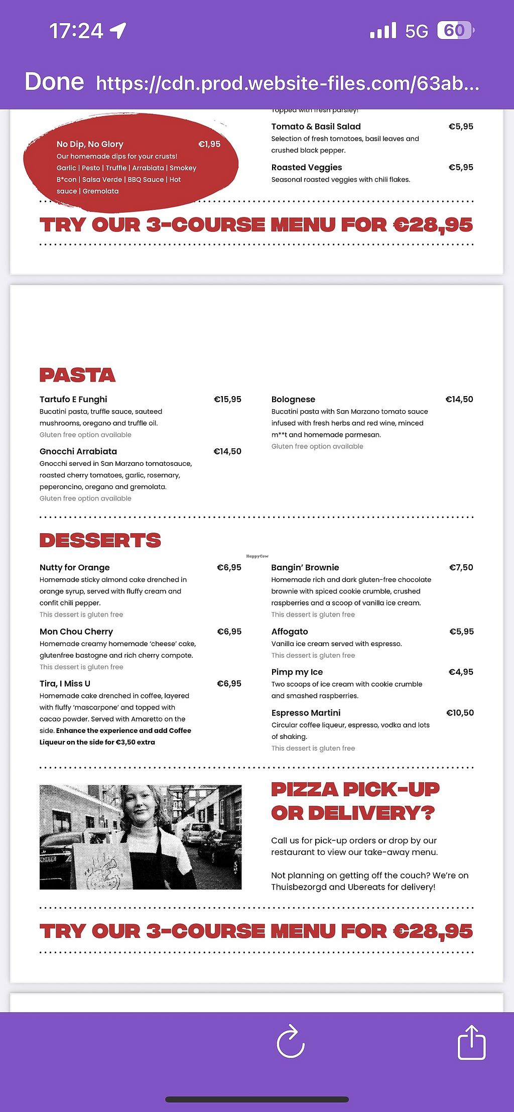 Is a really good pizza, the dough is delicious and the handmade cheese is very tasty. So far, my favorite pizza is Oh no, Pesto and Carbonara, but I want to try others soon.