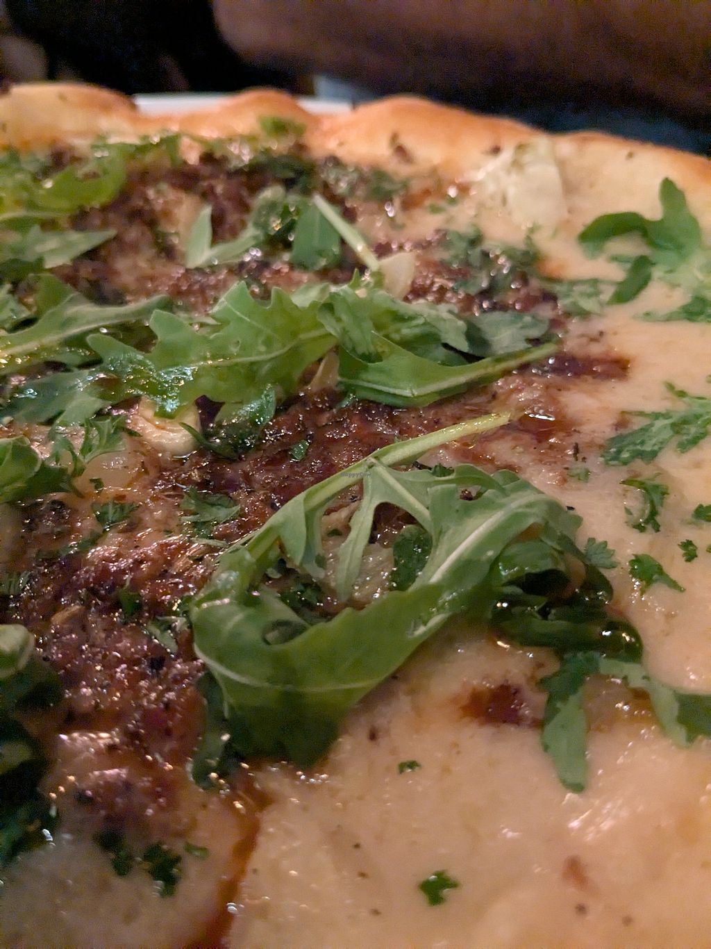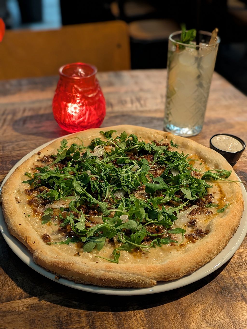 This place is beyond. I had the savage sausage pizza with bechamel sauce and tempeh sausage crumbles, you should definitely put that one on your bucket list. The arancini and calamari werd amazing. I may or may not have taken 3 desserts home, I can at least tell you that the monchou is amazing. Cant wait to come back!