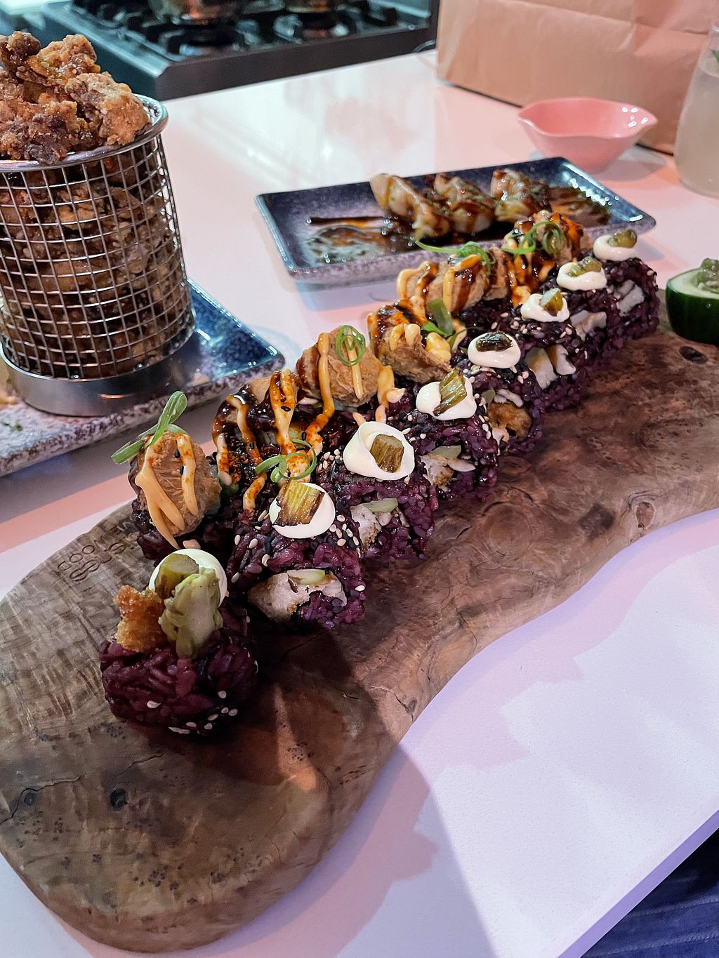 Woah! This place has some seriously incredible sushi! We tried some crunchy rice for starters, then two amazing rolls and baos. The flavors are incredible! One of the best vegan sushi places I have ever been too. Will def come back to try the rest!!