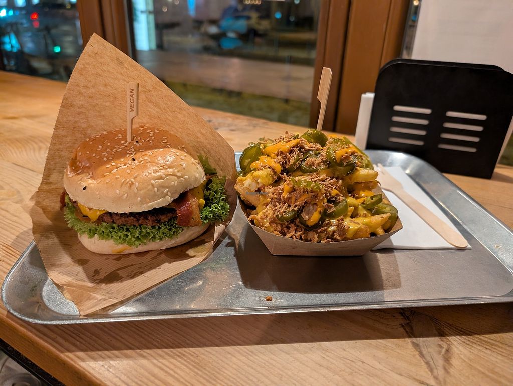 Incredible tasty burger and fries. Completely vegan menu with beyond meat, 'chicken' or no beef burger. Fries with different toppings, like chilli cheese, BBQ or classic ketchup/mayonaise.