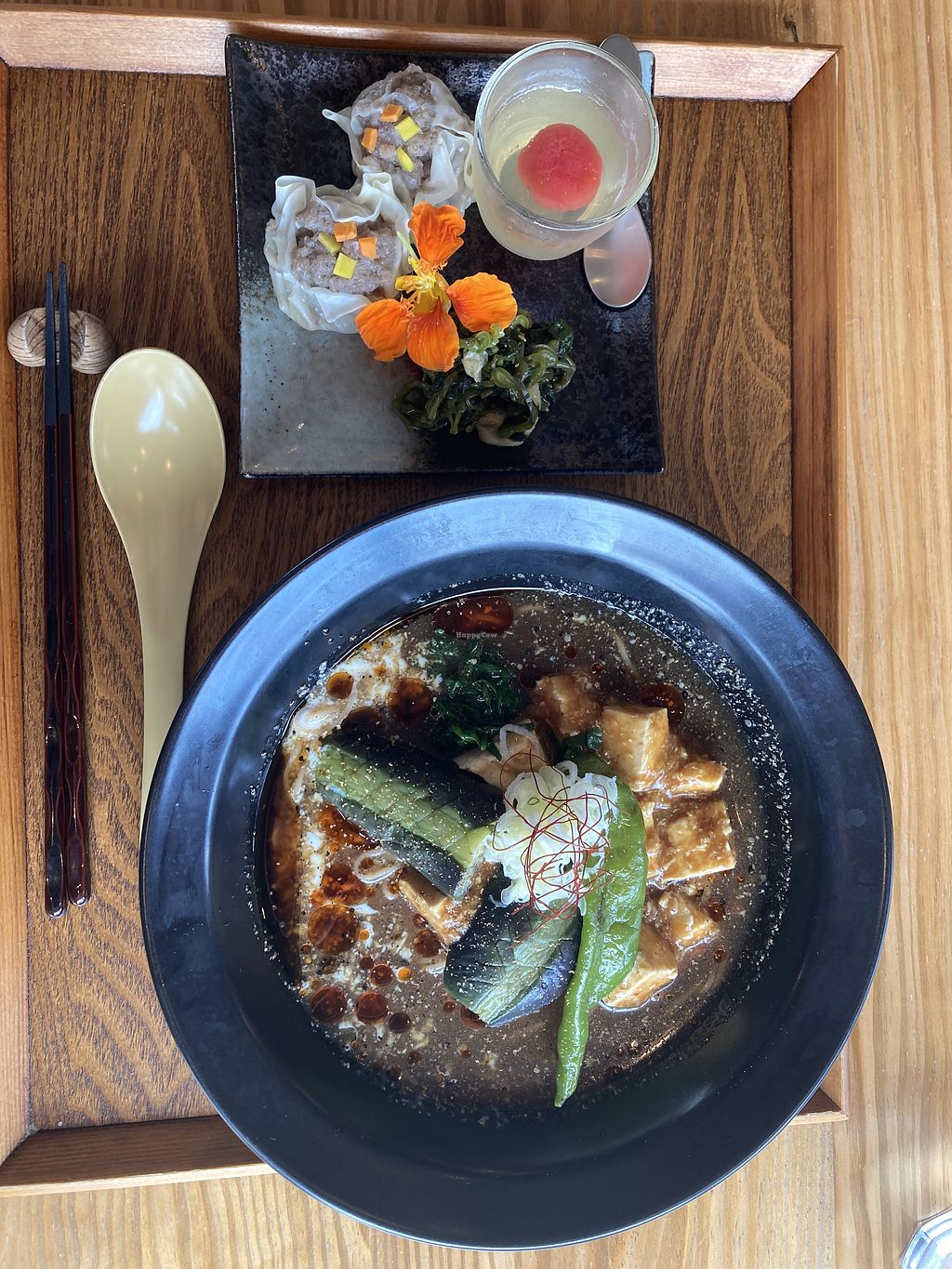 A vegetarian café, which is indeed rare here, however do note that most dishes contain milk/eggs, including their famous soy soft serve dessert unfortunately (All allergens are labeled clearly in the menu). Taking out the cheese might be possible, but as long as it's not replaced by some vegan cheese, it's left kind of shallow.