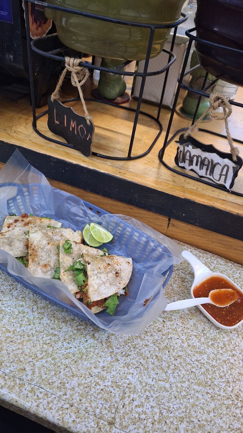 This place was part of a small Mercado in a pedestrian tunnel. It was super cheap and yummy. The tortillas were a bit greasy and definitely not fresh, but still a great option.