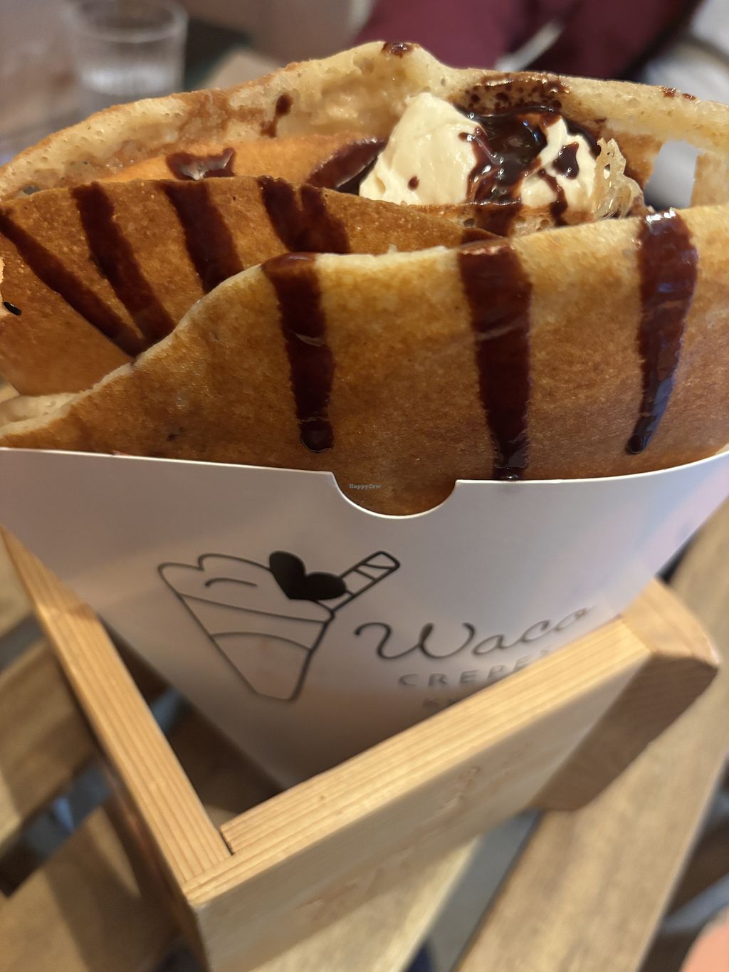 I got the vegan crepe with whipped cream and chocolate and it was delicious! The cream was nice and almost like a pudding.
