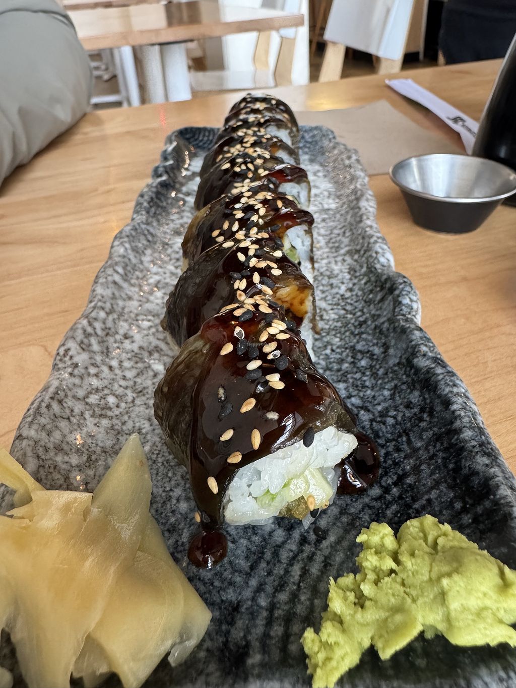 We recently just had an incredible eggplant unagi nigiri in Chicago, so we were excited to try the Ohnagi roll. The smokey sake roll was a bit chewy, but otherwise the rolls were great.