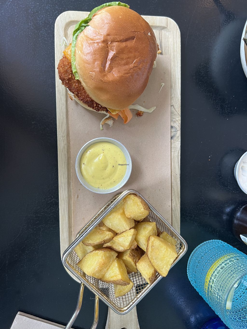 Menu looked good but dishes somewhat disappointing for what we paid. We had the pizza with vegan beef topping, the base was soggy and hard to finish. The topping was tasty but not enough of it, and it contributed to the sogginess. Shame. We also ate the not chicken burger with bun and patatas bravas. Tasty again but burger could have been more substantial, as heavy on the potatoes and bun. Good wines.