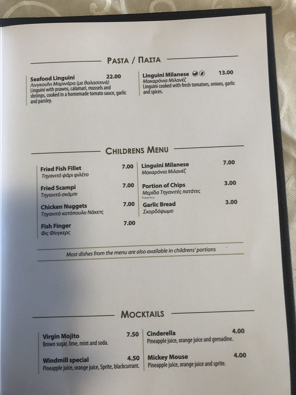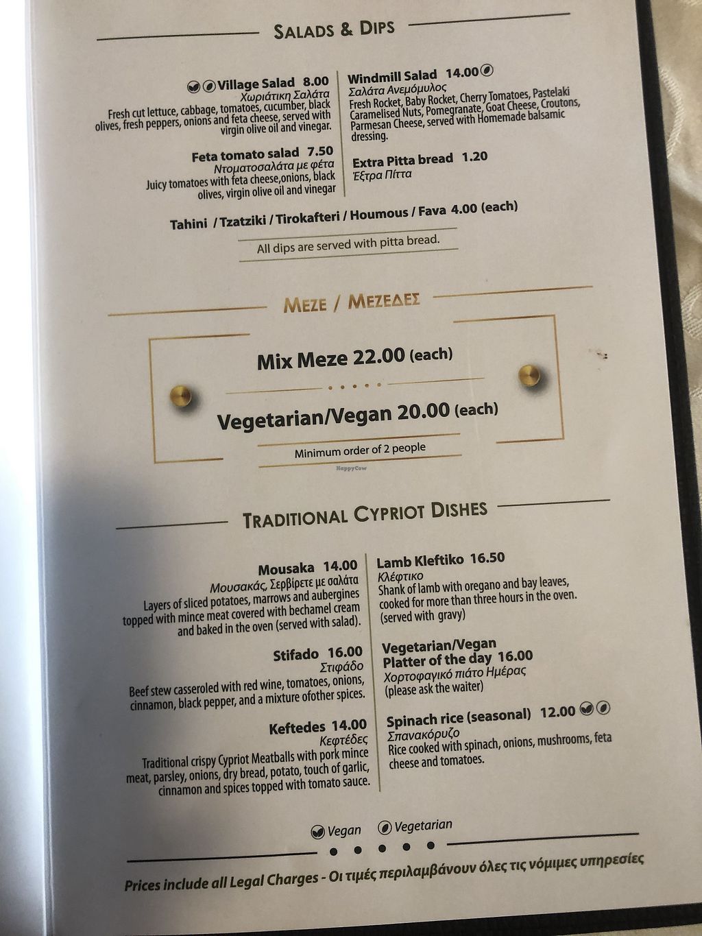Menu (double leaf is vegan) and first dishes of meze