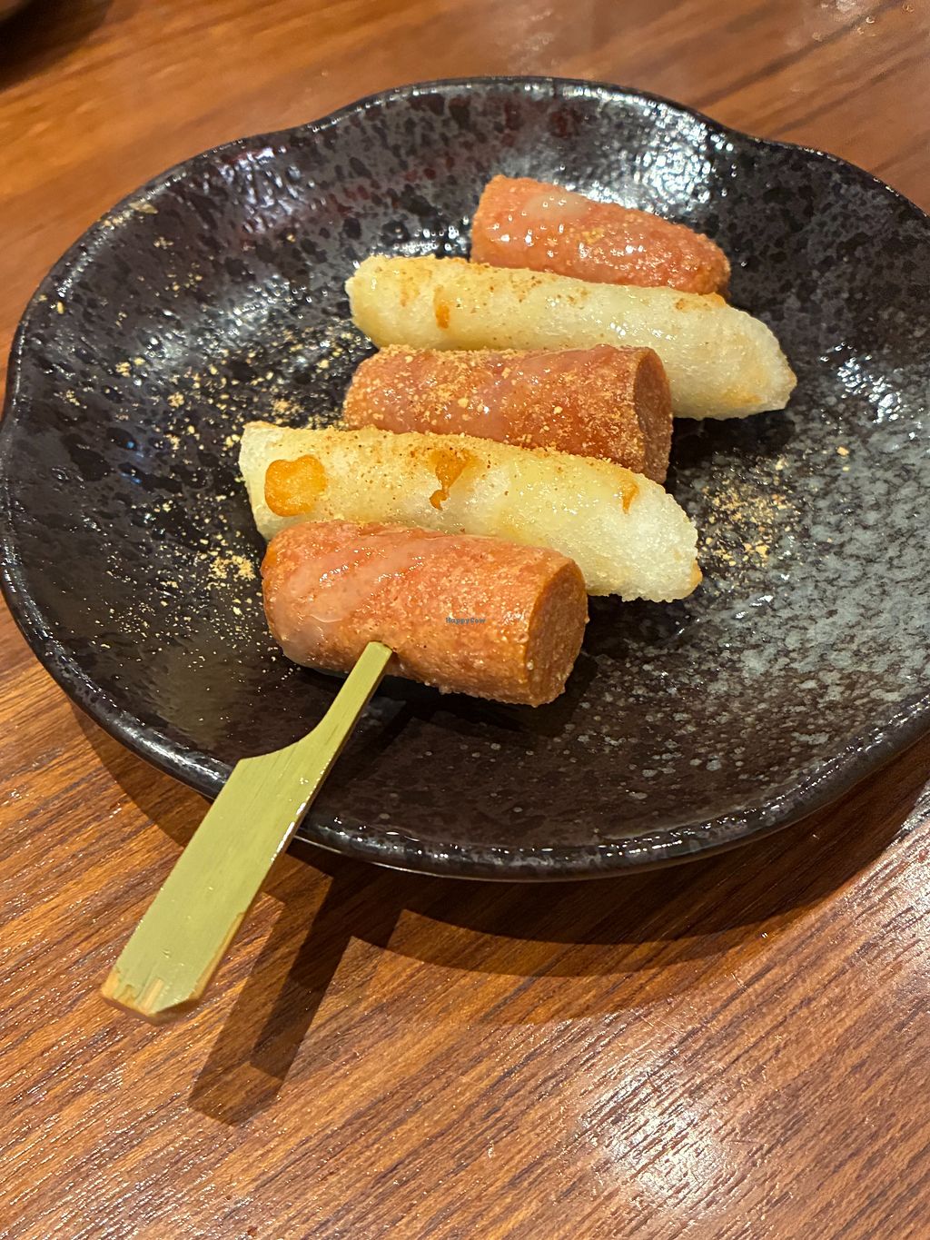 The Korean fried chicken hit the spot: two of the flavors are vegan (original salt & pepper and Korean spicy sauce). The chicken pieces are a mix of cauliflower, mushrooms, tofu skin, and soy nuggets, which keeps things interesting. It comes with a few tteokbokki (rice cakes) in Korean spicy sauce and pickled daikon radish.