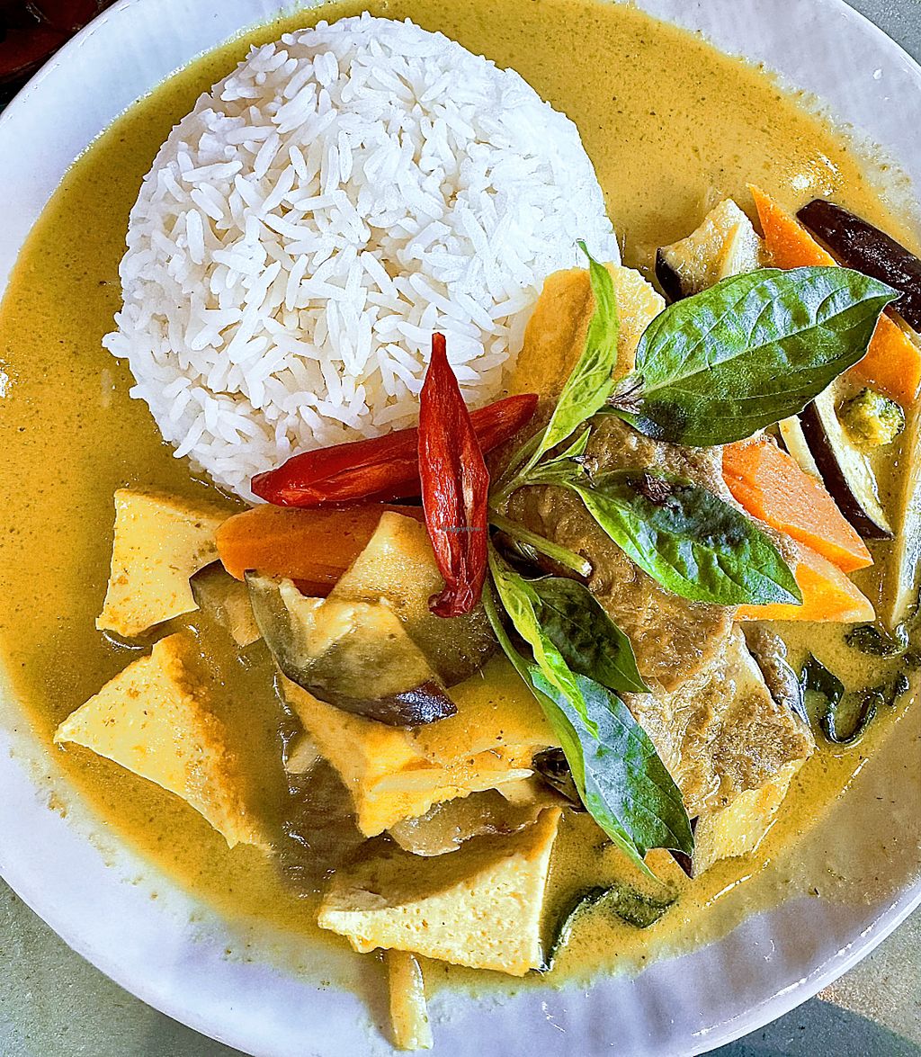 Thai restaurant with vegan choices. Example offerings include noodles, vegetable tofu stir-fry, curry puffs, curry and more. Fully vegan from May 2025. Open Mon-Sun 11:00am-10:00pm.